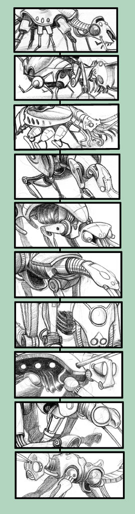 In early 2007, I got a call to see if I'd like about a day of work designing robot-creatures. How could I honestly say no? Turns out it was for a director in Europe who was putting together a proposal for a Nissan commercial. The idea was that these sort of sensor-type robots would transform out of the wheel wells, and run alongside the car. There was a whole series of these transforming Nissan commercials in Europe (never seen one here). So I worked and came up with these twenty-something quirky designs. They began as insectoid-crustaceans and as they evolved they took on more traits of greyhounds and pumas.